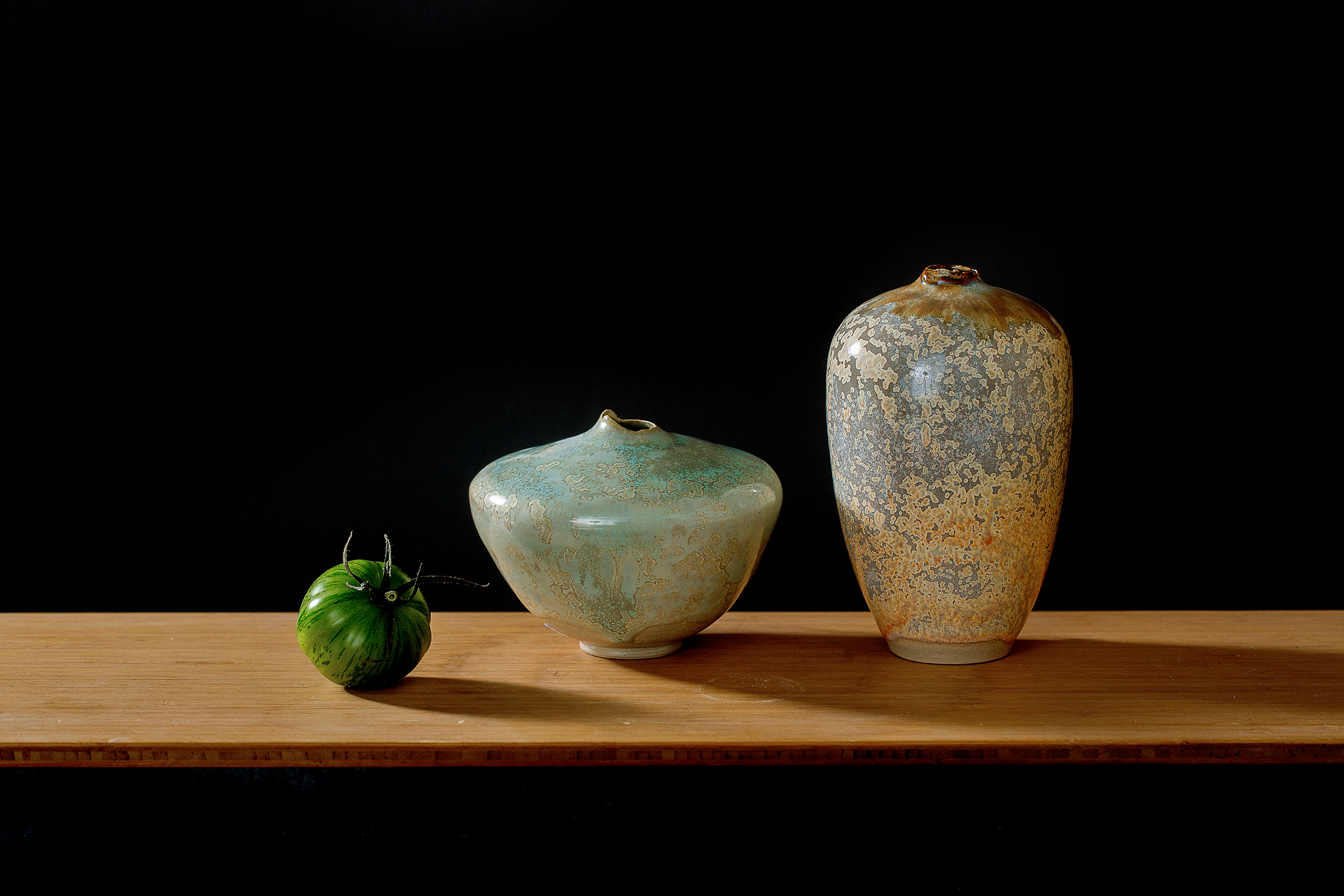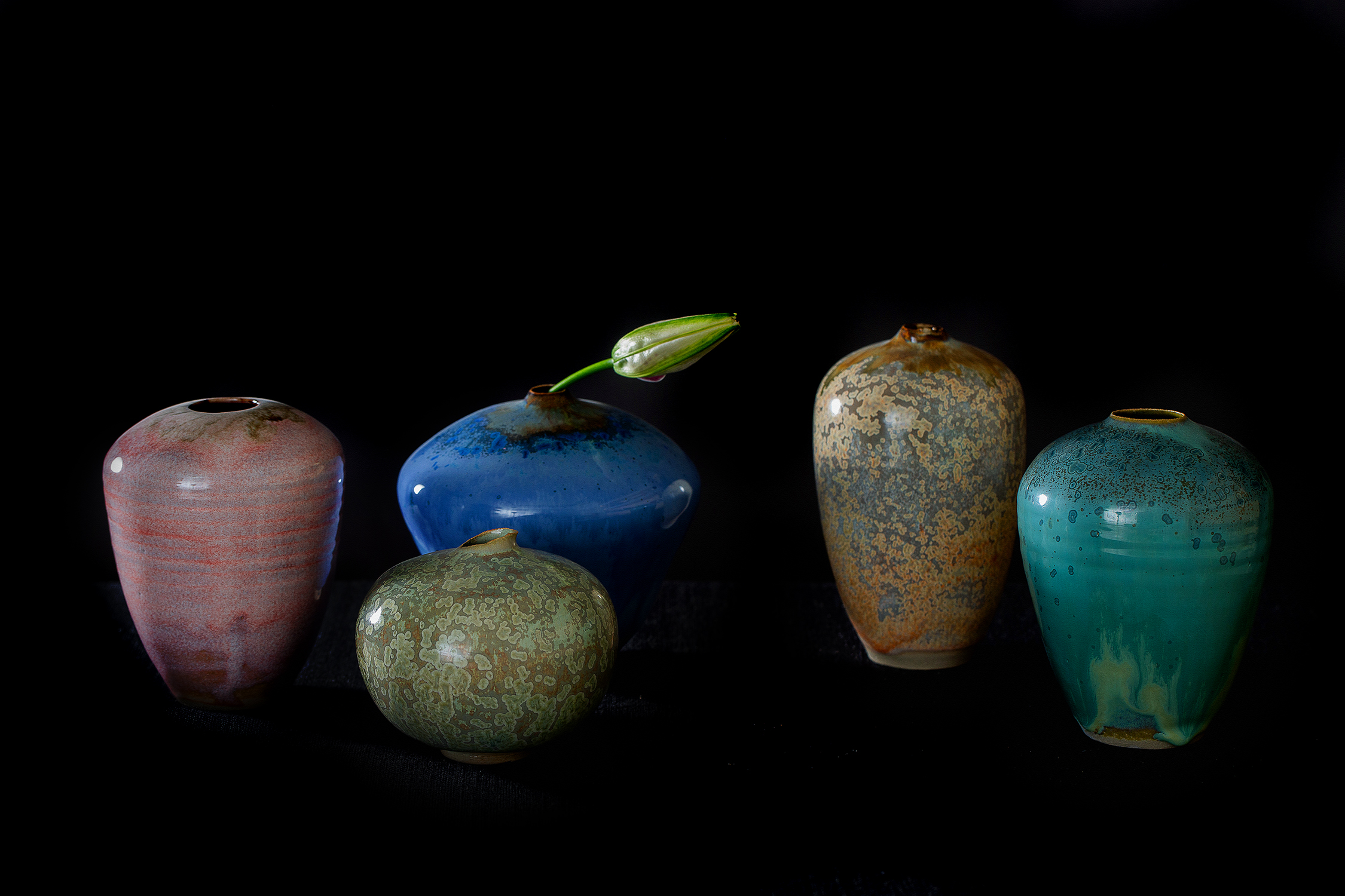 De kleurrijke micro kristalglazuren van deze collectie zijn als vanouds geïnspireerd door de Haarlemse luchten. En vooral de momenten waarop dag en nacht elkaar afwisselen of verschillende weertypen. De kleurschakeringen die ontstaan door de opgaande of ondergaande zon, nevel, wind, opspattend water uit de Noordzee of door bakken regen die uit de Nederlandse hemel vallen. Liselore verwondert zich niets liever dan over het prachtige kleurenspel dat de natuur tevoorschijn tovert en probeert dit te vatten in haar glazuren.